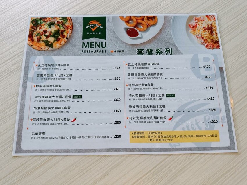 瓦立特⻄餐廳主打比薩、義大利麵、鬆餅、炸物和各種咖啡(豆)特調!