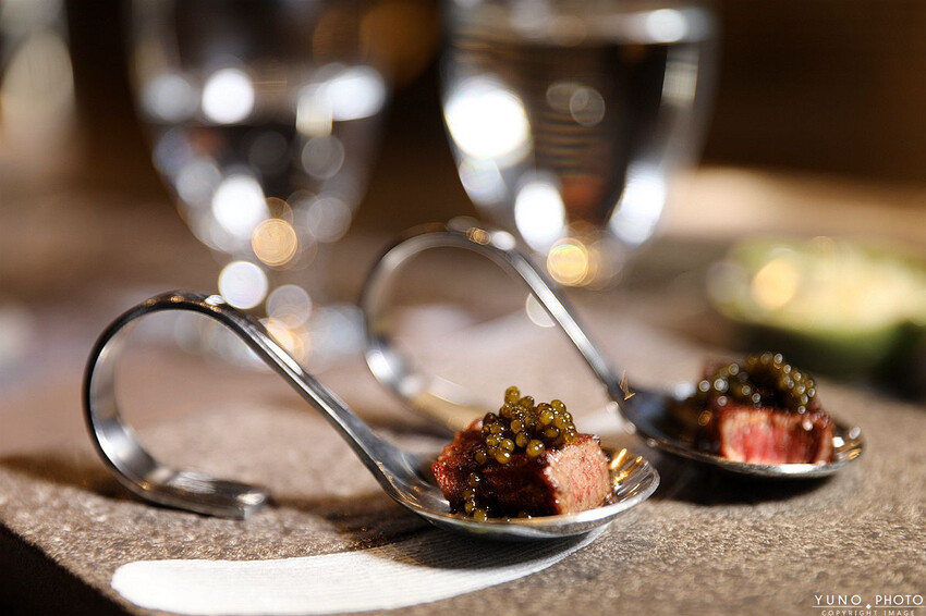 第六吃則是加入芙思塔海博瑞鱘龍魚子醬整塊吃進嘴裡可以感受軟嫩多汁的牛肉與魚子醬一顆一顆在口中爆開