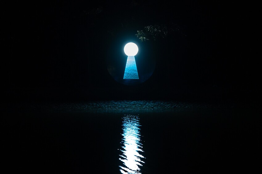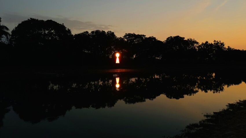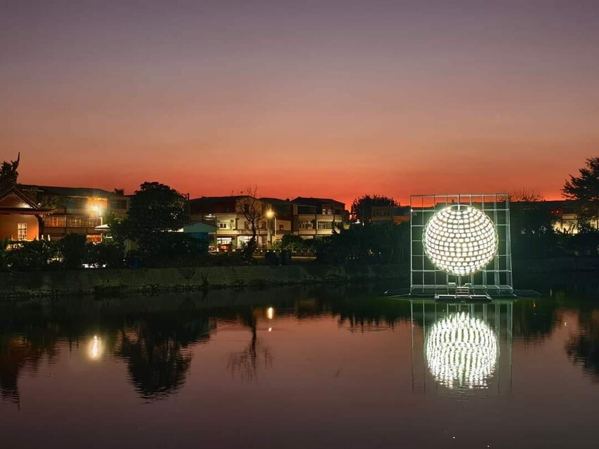 好幾盞小燈組合成一個地球的圓形,在黃昏色澤的襯托下,看起來就彷彿水裡的月亮,這構圖美極了!