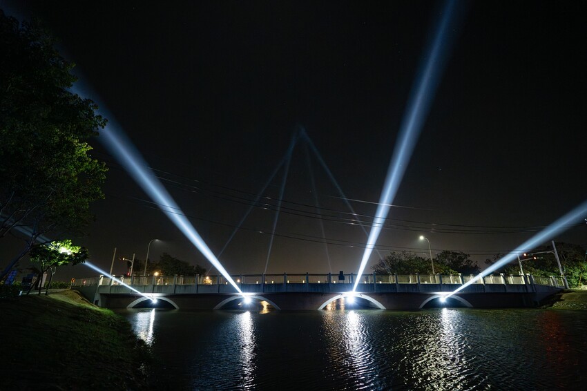 從橋墩底下用強烈的探照燈打出放射型的光束,彼此間不但會平行,光束還會互相交錯,也是一種另類的呈現方式