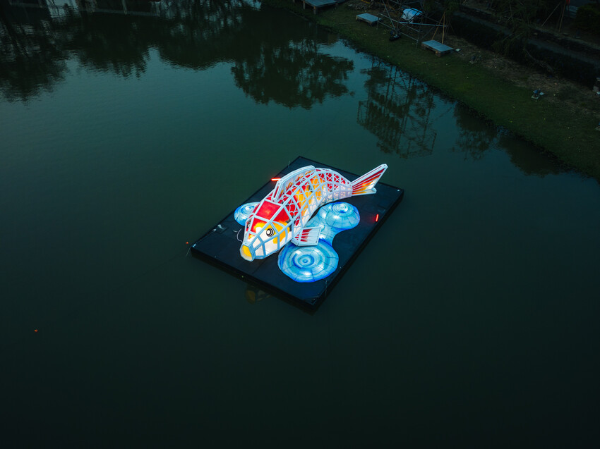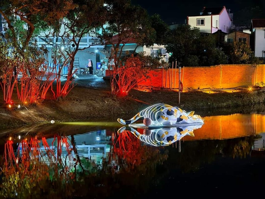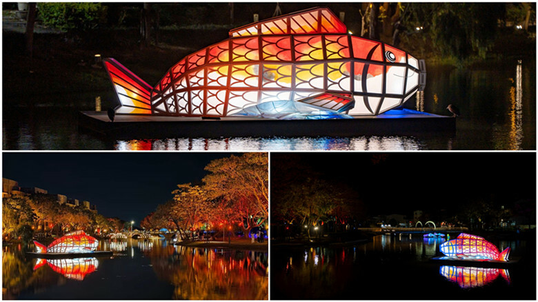 由錦鯉散發出來的燈光,跟岸邊投射的燈剛好能相互輝映,因此吸引不少人對著它猛拍,各個角度都有不同的美
