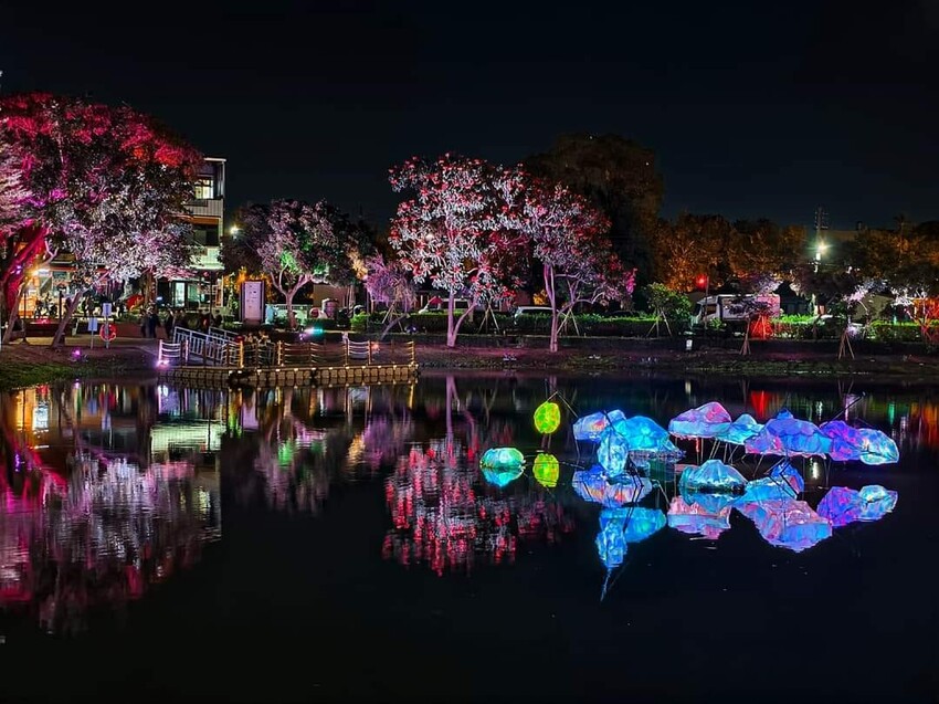 月津港的特色就是燈光映照在水面上特別美,有一種鏡射的效果,湖中的看起來應該是蓮蓬吧?水面跟岸邊的燈光合起來就能構成一幅迷人的光影