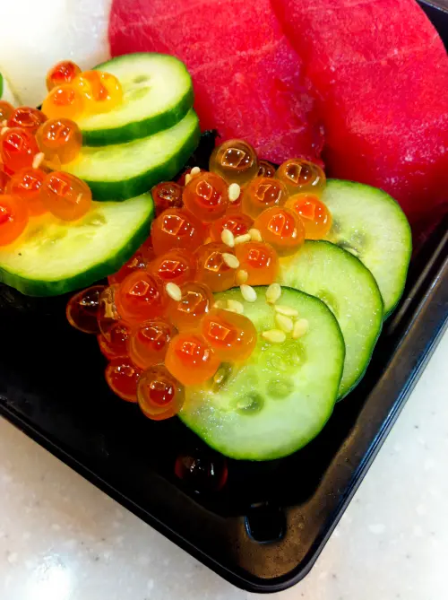 鮭魚三味有鮭魚、鮭魚側腹加蘿蔔+鮭魚加鮭魚卵,這一瞬間我真的有覺得這口味好台灣特色