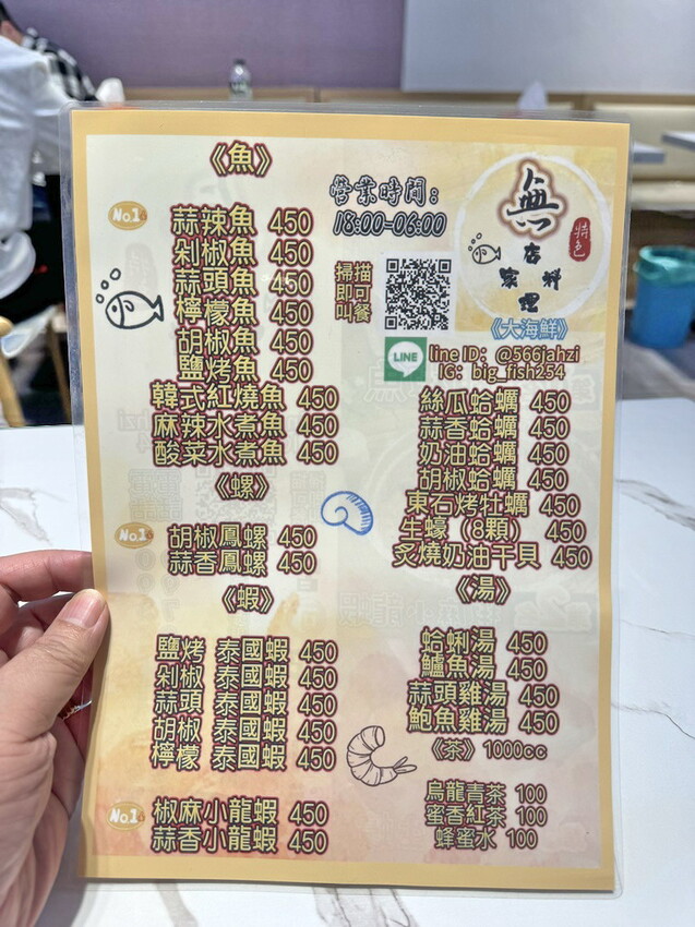 不只是晚餐、宵夜時段,晚上至清晨六點前,也可以吃得到烤魚、小龍蝦、鱸魚湯、鮑魚雞湯等海鮮料理