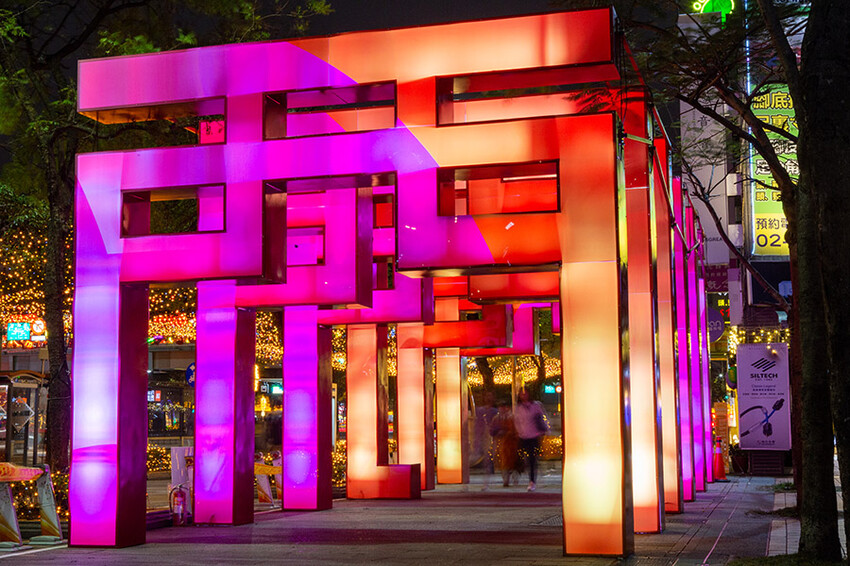 以西門町三個字做為主題燈區的入口意象,以仿日式鳥居牌樓形態打造,組成中華路上最耀眼的廊道。