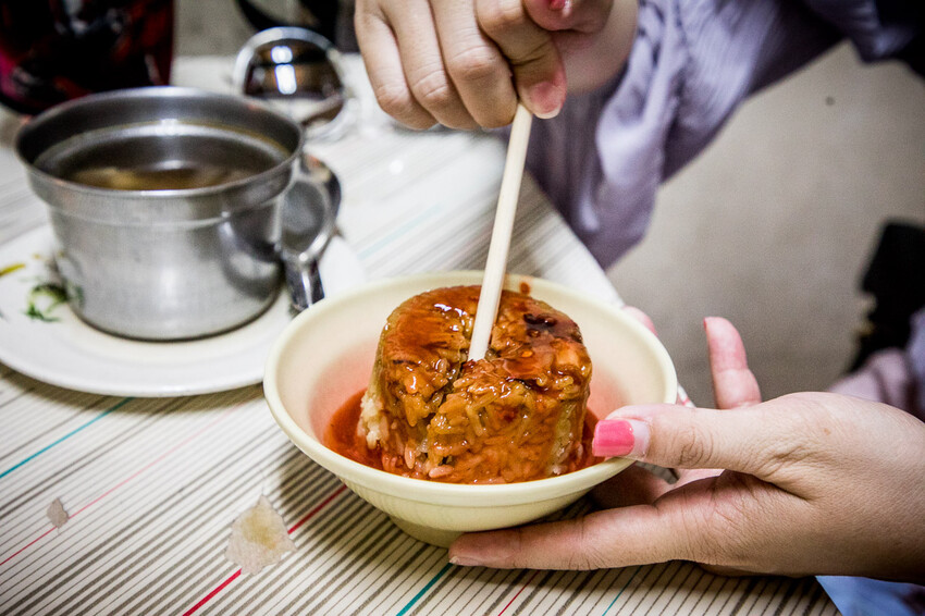 筒仔米糕,當地人都叫他『紅米糕』,由來就是外面淋上的紅色醬汁,看起來很像是甜辣醬,但它不會辣,就是甜甜鹹鹹的,米糕吃起來很有味道,軟軟糯糯,還有濃郁的肉燥香氣,算是很好吃的米糕,而且一顆才$25!