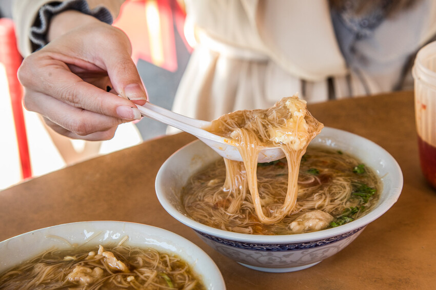 王罔麵線糊的麵線顏色比較偏白,看起來好像很清淡,但其實因為裡面加小蝦米味道香氣都很濃郁,裡面還有赤肉條、蛋花,口感滑順,除了肉要用咬的,其他幾乎入口即化,可以用喝的,一碗25元真的很讚!