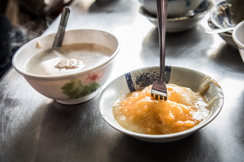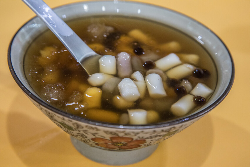 港城施豆花的自己熬煮的糖水有淡雅的甜香,入口不甜膩,豆花表現不錯,頗有豆香,口感略有彈性,抿一下入口即化,必加圓仔!港城施豆花的圓仔外觀是圓柱形,口感比一般湯圓更有彈性許多,咀嚼時還能感受到糯米的香氣,Q彈軟滑的口感吃上一口就讓人停不下來