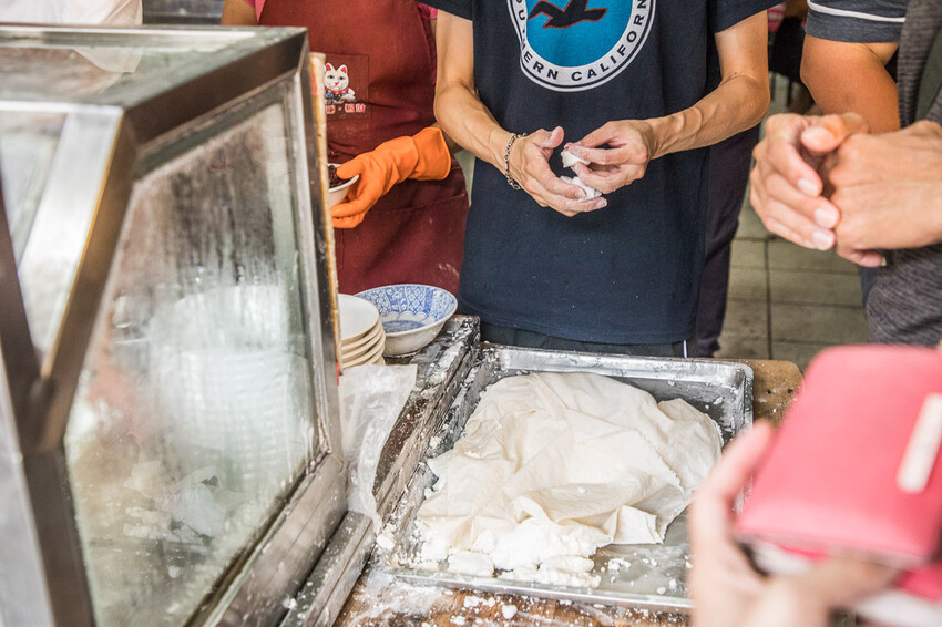 北港圓仔湯的圓仔都是現做的,只見老闆拿起一個小米團揉成條狀,再一顆顆剝進熱水裡,煮到浮起來就是好吃軟Q的圓仔了,然後看要做成圓仔冰或是熱的圓仔湯都可以,老闆剝圓仔的速度有夠快,一下子不到十秒就剝好一碗圓仔的量