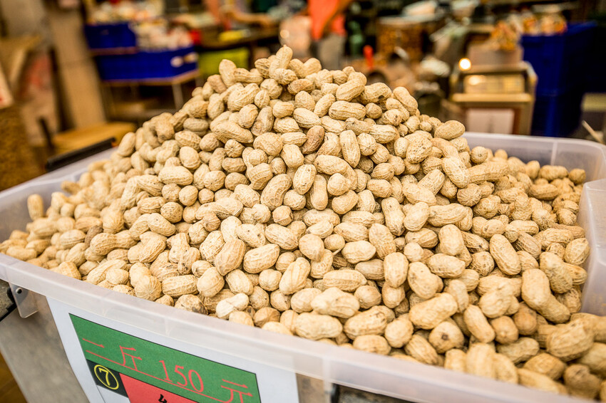 門前有一整排的各類花生可以試吃,可以每一種種類口味都吃看看再來買,吃了沒買店家也不會怎樣,就給大家大方吃這樣,地上都是花生殼,店員也會一直補花生上去