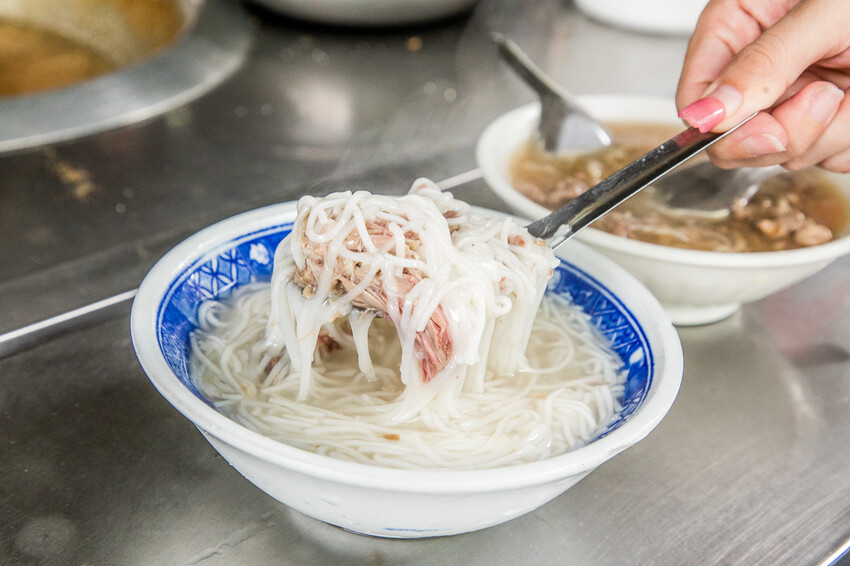 輝煌牛肉湯標榜的就是只用在地台灣牛,而且連內臟類都是,點了之後阿伯才會開始燙牛肉,攤前那鍋牛肉高湯看起來就超濃郁的,阿伯會把鮮牛肉放到網勺裡再下鍋涮到五分熟,然後再淋上牛肉高湯