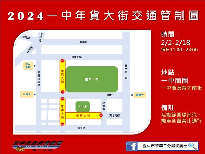 這張是台中第二分局借來的一中年貨大街交通管制圖,有些路段封街變成方便大家逛的年貨大街,其餘路段比如連接中科大和台體大的育才街,車子還是可以通行的