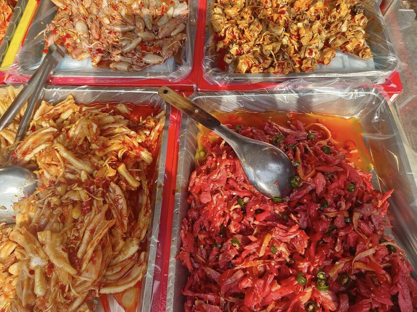 不讓天津路年貨大街專美於前,一中商圈也推出一中年貨大街,春節期間來逛一中街的人也不少,有哪一個攤位特別值得停留駐足呢?當然要介紹這家鴻福源去骨鳳爪,因為這是我國中好友兒子的攤位,涼拌菜好吃又入味,總共有12種小菜,來鴻福源買下酒菜回去配密魯也很搭,小心越吃越涮嘴,一試成主顧喔!