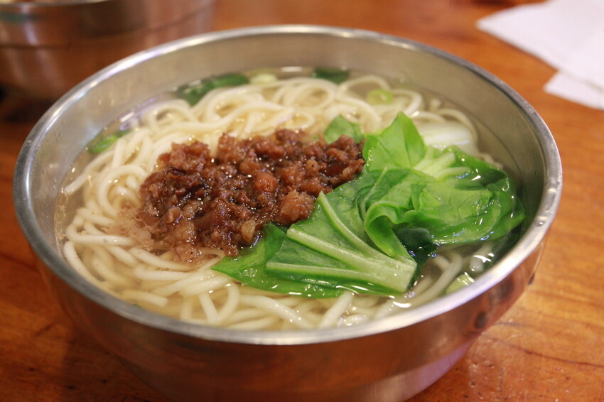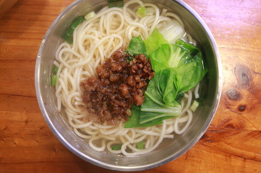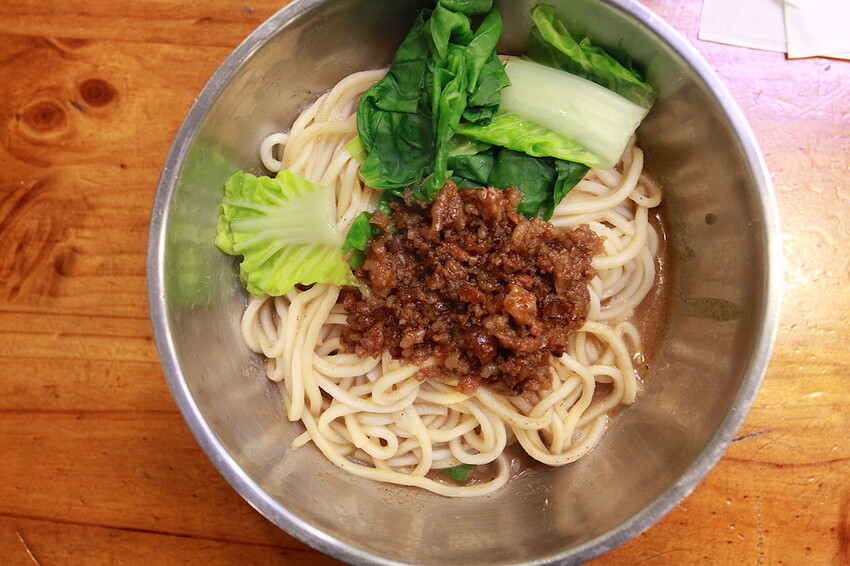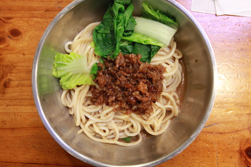 麻醬乾麵直接淋上滿滿肉燥來提味,再鋪上幾根燙白菜來搭配。