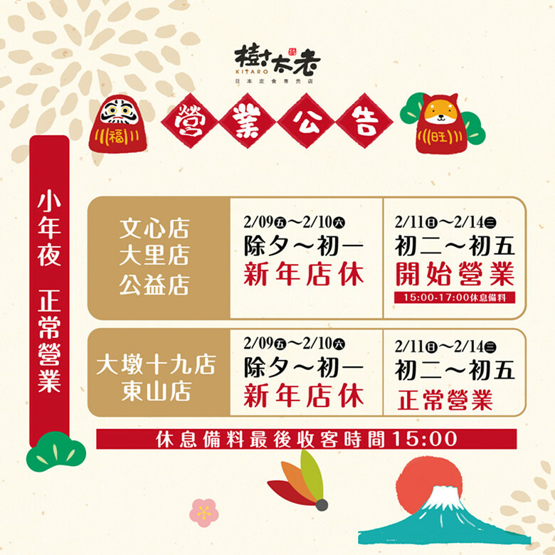 樹太老的春節營業時間分成二種,外面的門市店除夕~初一店休,初二起正常營業
