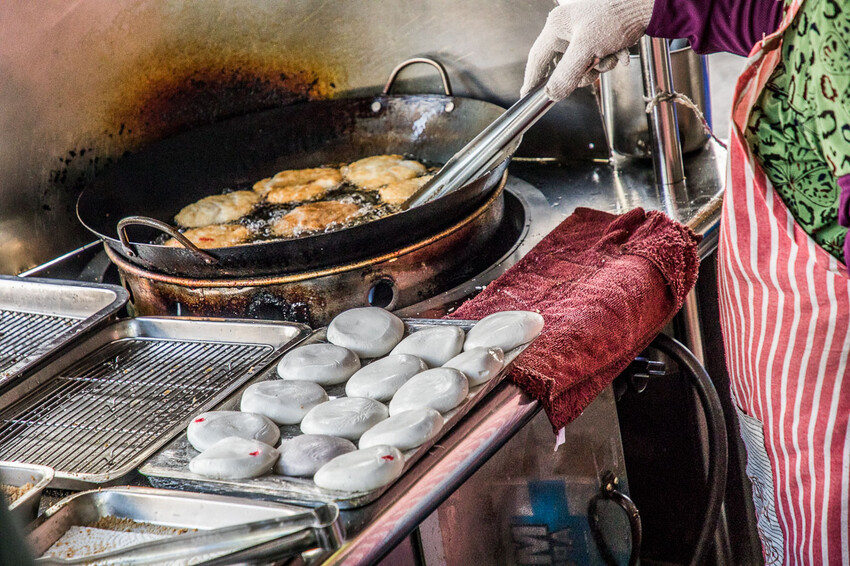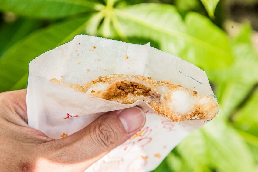 外面吃起來的口感跟味道很像喜宴辦桌吃的紅白湯圓,外面很酥香。裡面更軟更Q一點,裡面包的餡料不算多,但很平均的分佈,花生的香氣比較濃,也帶有顆粒感,通常也是最快賣完的,芝麻餡有點像芝麻湯圓裡的那種流沙感,也很好吃