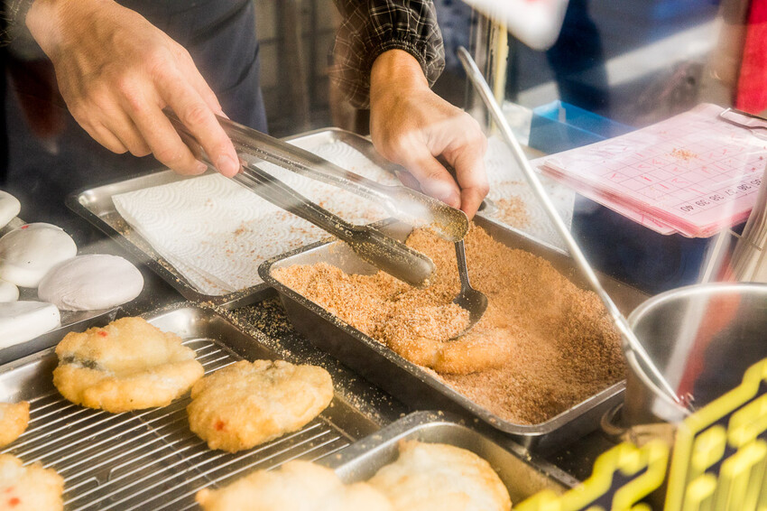炸麻糬的做法就有點類似白糖粿,是把麻糬下油鍋不停地翻動,麻糬受熱便會漸漸變大變澎,看起來簡單但很考驗火候功夫,炸好的麻糬再拿到旁邊的鐵盤上瀝油,然後再裹上一層厚厚的花生粉就完成了
