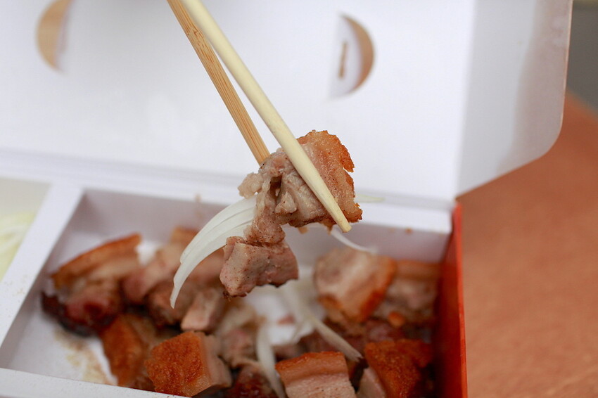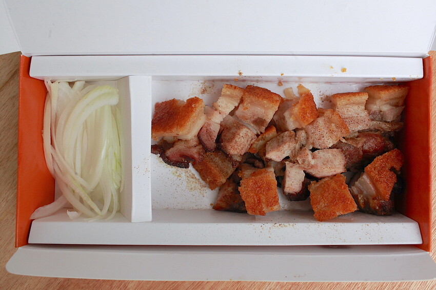 店家製作專屬的包裝盒視覺感滿滿,裡面不知有烤乳豬還附新鮮的洋蔥。