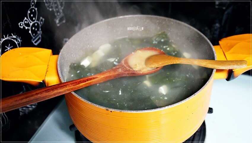 平常我們都是把豆腐、海帶和味噌一起下鍋煮,但是日本Hanamaruki鰹天下米味噌的煮法有點不太一樣