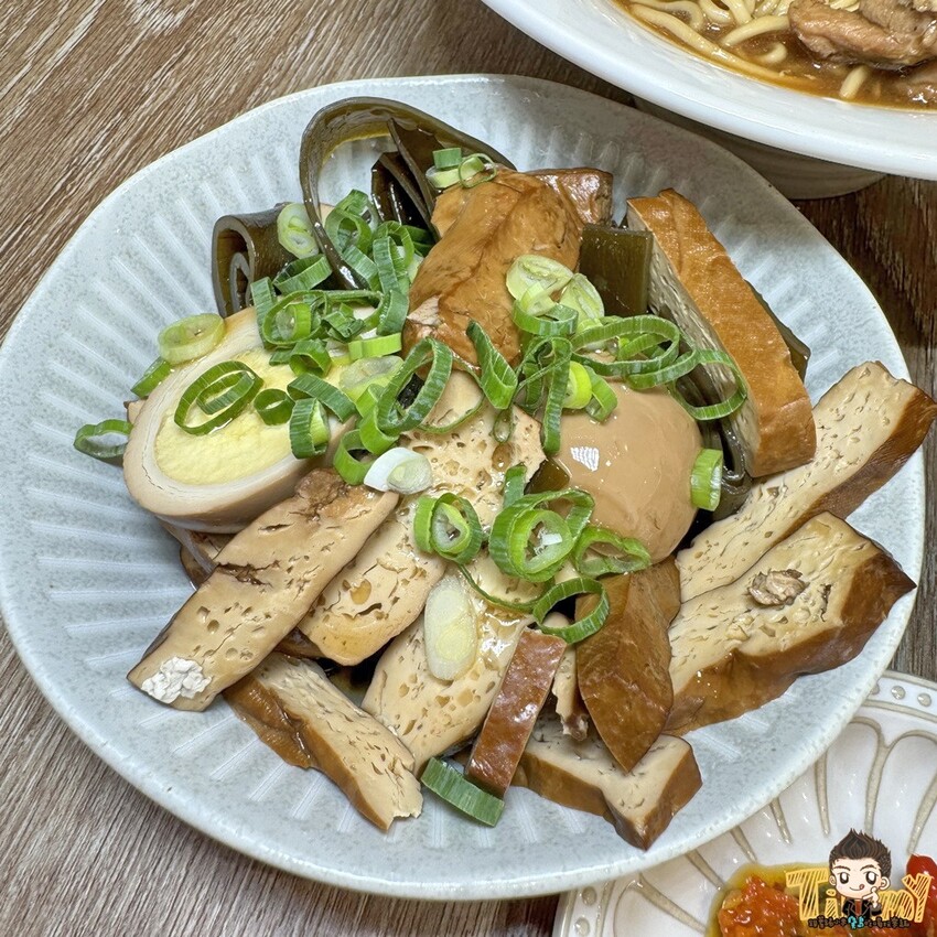 滷味拼盤(80元)有滷蛋、豆干和海帶。
