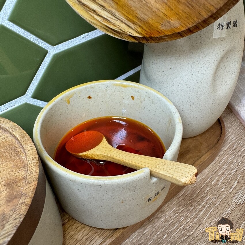 店家自製的辣椒油在櫃檯旁的櫃子上,可以自行取用。