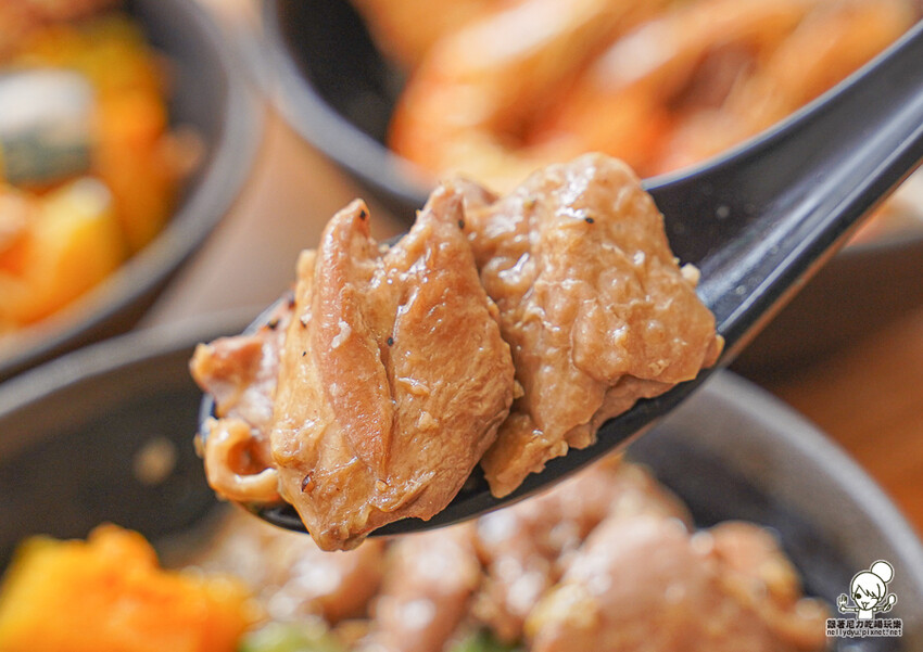 去骨的嫩雞肉,使用秘製黑胡椒提味,讓米飯更加夠味、下飯