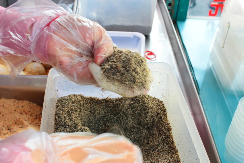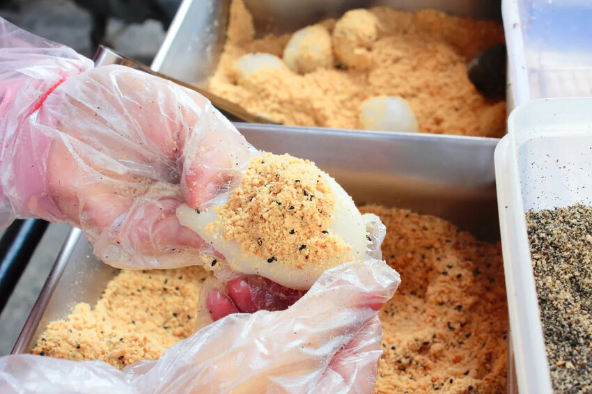 老闆娘正在忙著包裹芝麻口味的麻糬呢!手上一揮,刀下快如閃電,速度真是太快了!而且你能聞到整個空氣中飄散著芝麻的香氣,實在是相當迷人啊!這畫面真是讓人垂涎三尺,絕對是饞人的一大誘因。