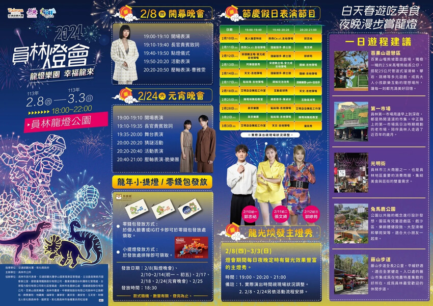 員林燈會暨元宵節活動就是現在啦,從2月8日開始燈光璀璨,今年的主題是「龍燈樂園 幸福龍來」。整個龍燈公園都像是個大型遊樂園,超適合春節期間的遊客。這可是時隔12年才再度喚醒的大龍,從2月8日一直到3月3日。白天你可以來員林享受遊樂,晚上再來感受一下燈光秀!這可是全國民眾一定不能錯過的盛事。趁著這個機會,白天晚上都來員林一趟,享受不同的燈會魅力吧!