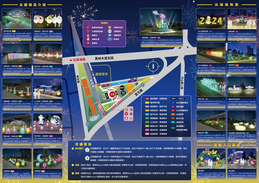2024龍來員林、福氣滿堂、2024閃耀員林、泡泡世界、星光大道、選轉木馬咖啡杯、海底世界、雲朵飄飄/恐龍探索樂園、叢林探險與岩山探險。