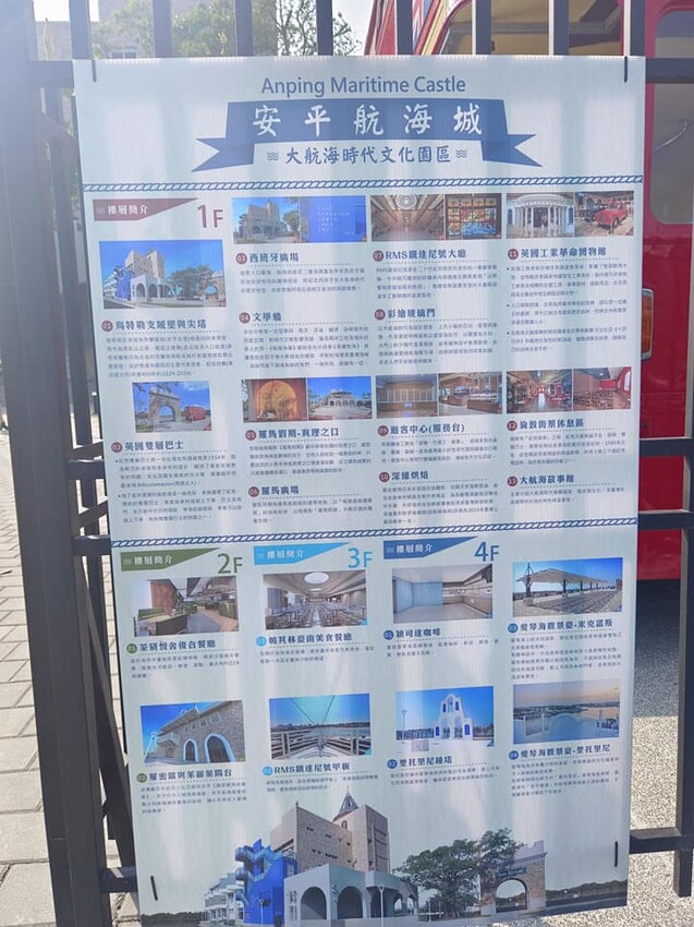 從安平水景橋一下來,馬上就能抵達安平航海城,就連大門也設計出城垛的模樣,旁邊還停了一台紅色的雙層巴士,外觀就十分搶眼