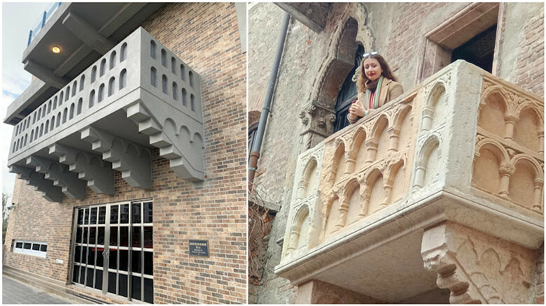 安平航海城有一個茱麗葉的陽台,我在義大利維洛納Verona(相傳是羅密歐與茱麗葉的故鄉),有拍到原版的陽台,據說登上陽台還要花好幾歐才能演一下茱麗葉,領隊說沒事別亂花冤枉錢,還是去米蘭大教堂登頂比較值得花,沒想到拍攝瞬間還那麼剛好,恰恰捕捉到一個外國美女往下看,這下就值回票價了