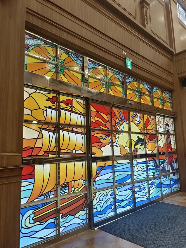 自動門的後面竟然是彩繪玻璃,雖然是用貼的,但充分彰顯了大航海時代的氣勢,包括帆船,燈塔和躍出水面的海豚,背後還有一輪落日當背景,象徵日不落帝國的全盛時期,拍起來也挺好看的