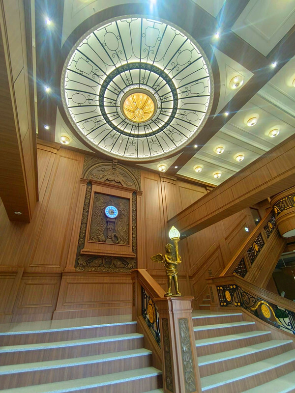 不過最引人注目的,還是這個還原電影鐵達尼號的大廳,挑高的美麗天花板和二旁的樓梯,彷彿下一秒鐘蘿絲就會提著裙襬,款款從樓梯上走下來