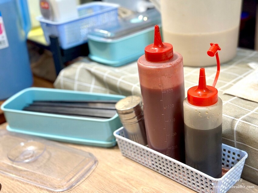 桌上的調味料,醬油、甜辣醬、胡椒粉,簡單明瞭。