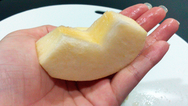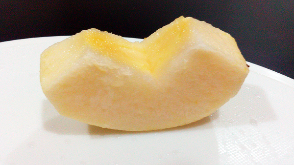 先來看看果肉和果皮顏色的對比,果肉是成熟蘋果才會有的嫩黃色,顯示朱鷺蘋果正處於最適合品味的時刻。