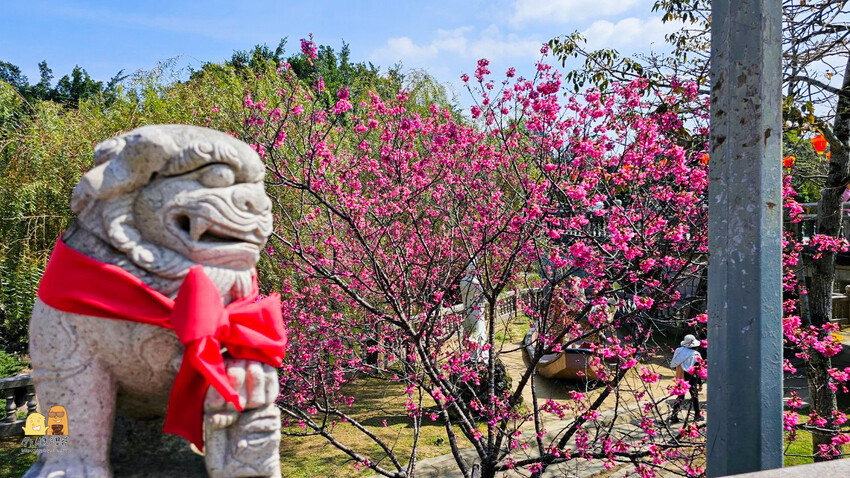 粉嫩色的櫻花將嚴肅的石獅子點綴成花中少女