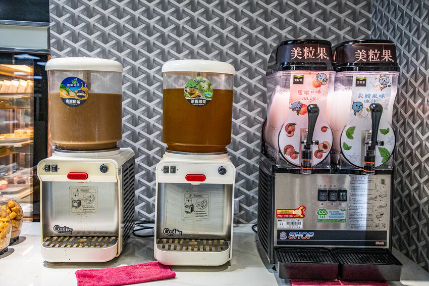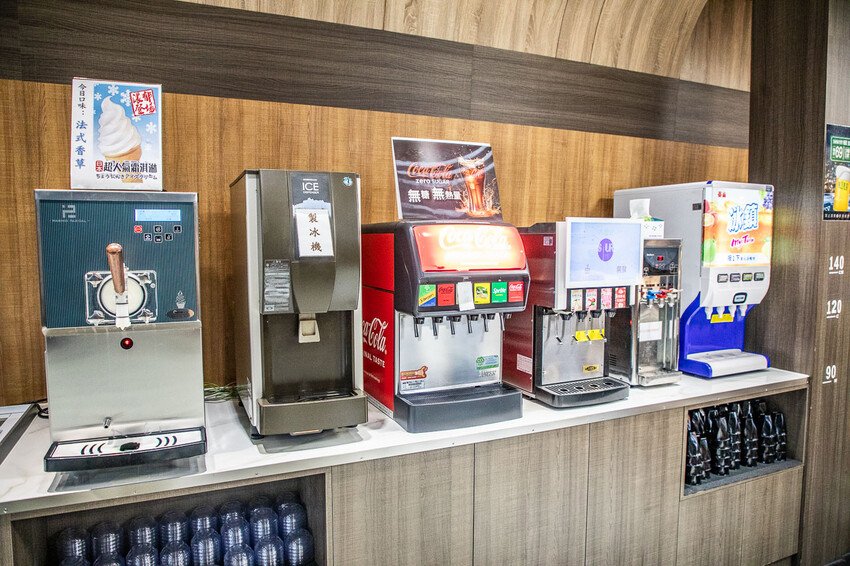 飲料區,可樂、雪碧、奶茶、冰沙、咖啡應有盡有,可樂雪碧還是瓶裝的呢