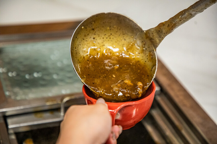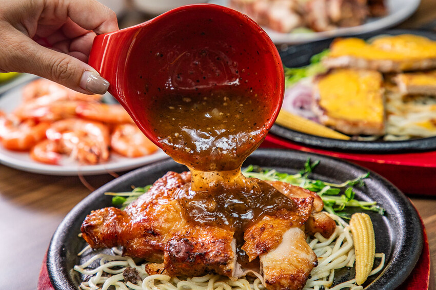 接著就可以淋上黑胡椒醬,這的黑胡椒醬非常夠味,香氣很足,帶有微微的鹹度,搭配雞排吃很棒,也可以當作鐵板麵的醬汁唷