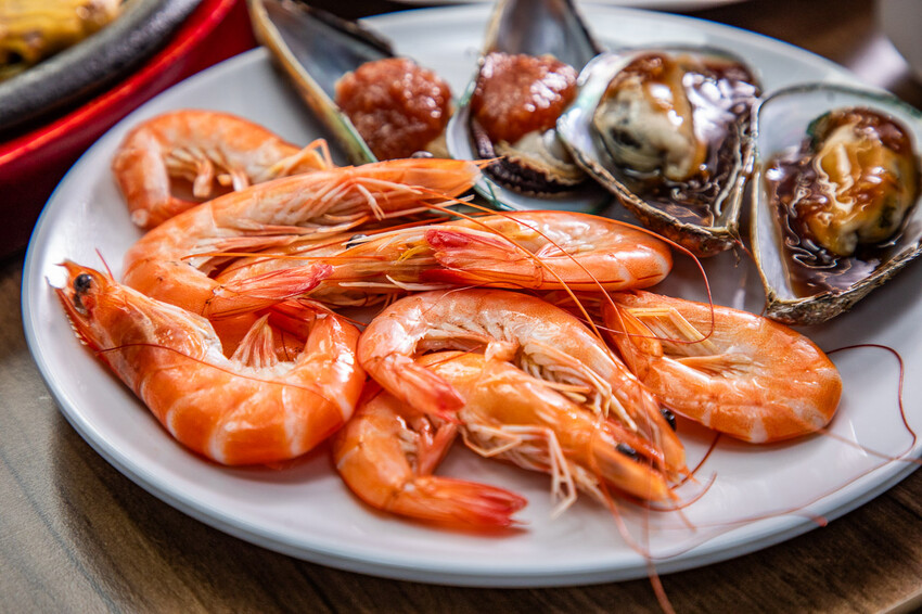 冷盤區,有白蝦、花枝、淡菜,還有各式涼拌小菜