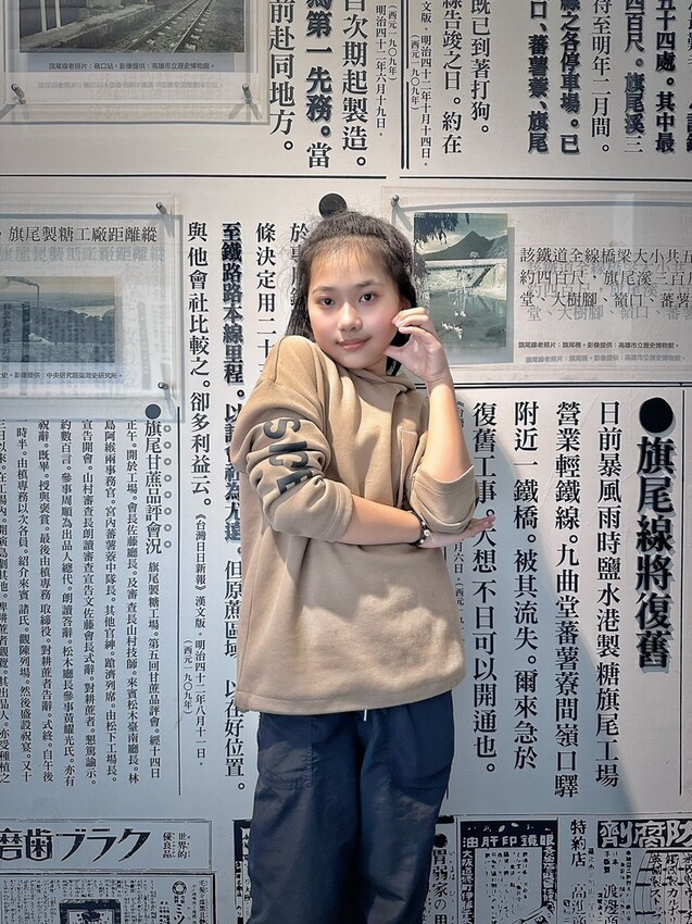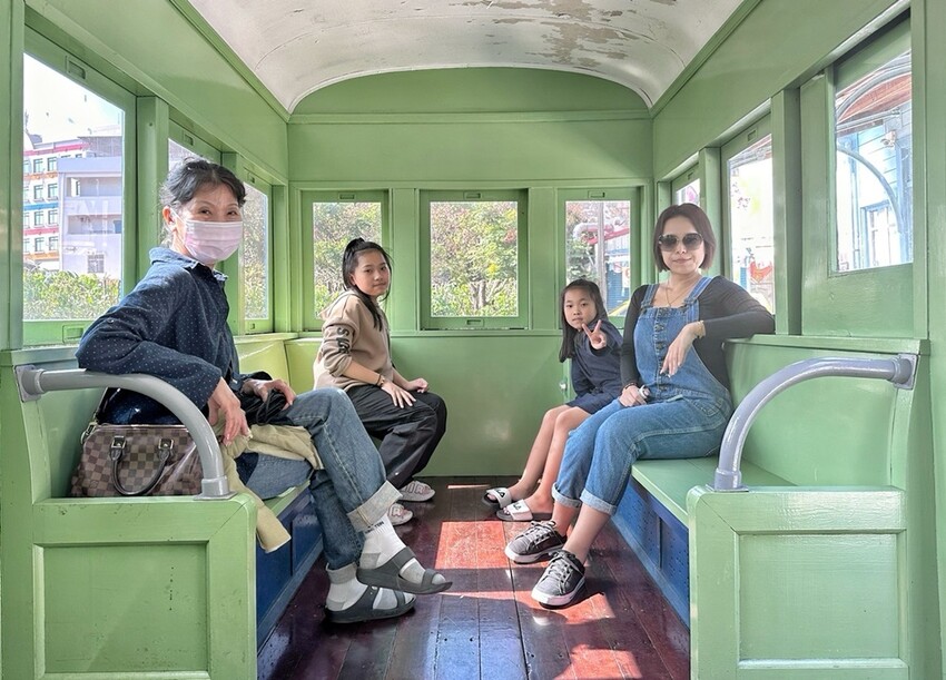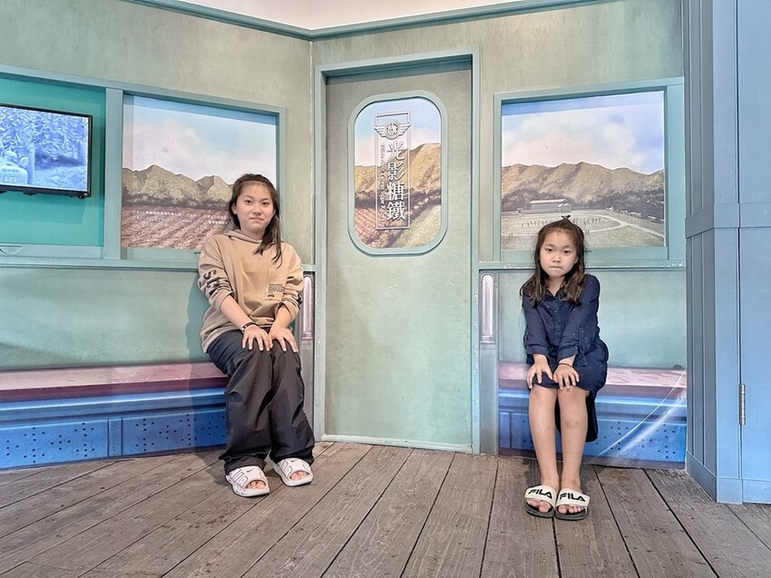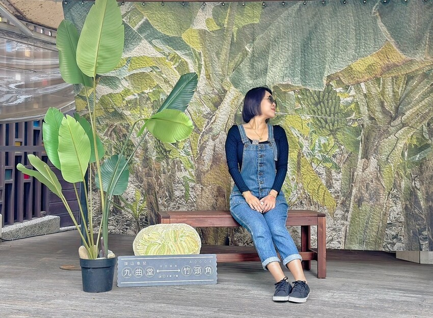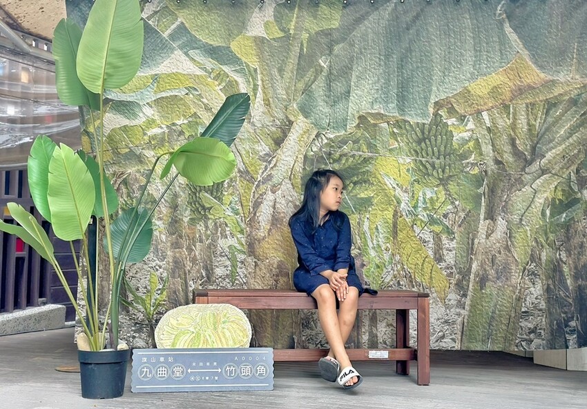 園區最角落則是車長體驗,大人小孩的車長服都有喔!但我們就單純坐在板凳上拍照,布景可是旗山有名的香蕉。