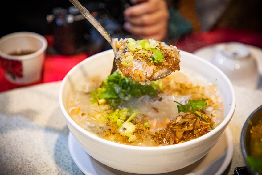 海產粥,阿水飯店的招牌,每桌都有點,這是中碗的,裡面有魚肉、蚵仔、吻仔魚、蝦子,上面撒了柴魚片、香菜等,海鮮的鮮味完全融入粥裡,而且海鮮料很多每一口都可以吃得到