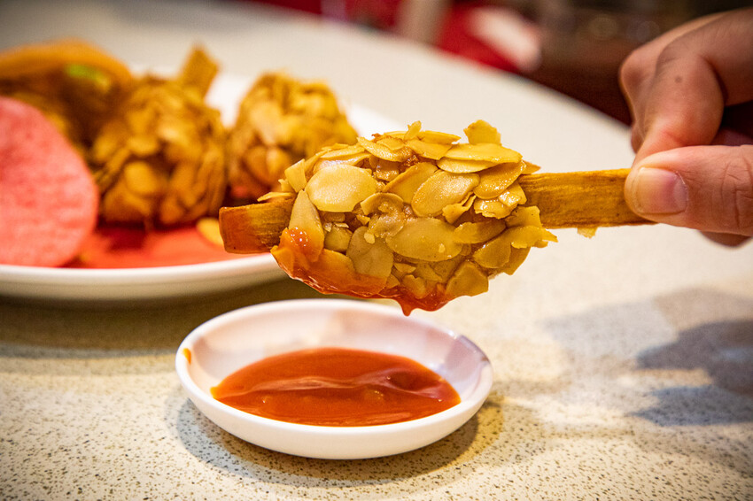 甘蔗蝦,這也是阿水飯店的招牌,可以單點一根是60元,甘蔗蝦的外面沾了滿滿的杏仁片,但吃不太出來蝦的存在感,中間那根真的是甘蔗,吃完蝦可以咬一下挺有趣的
