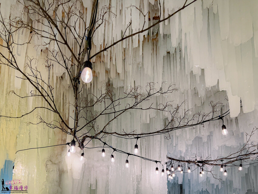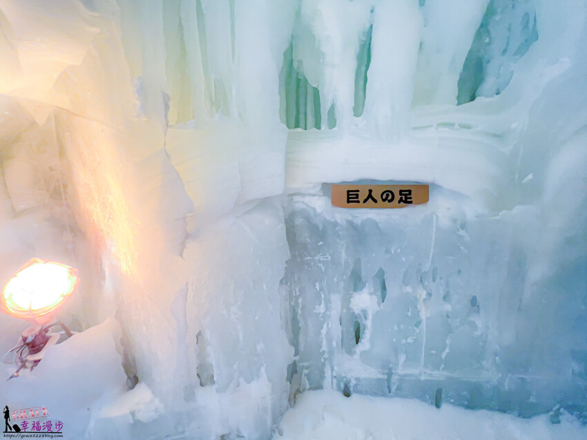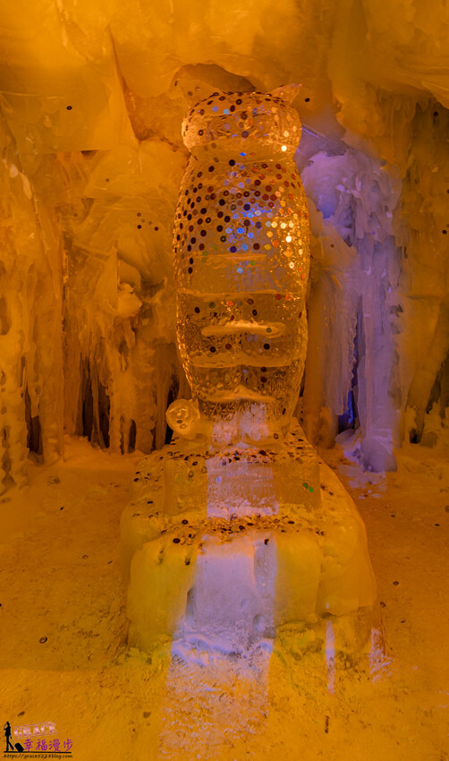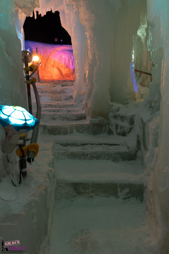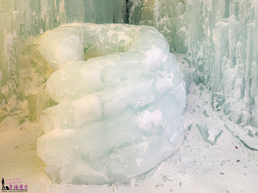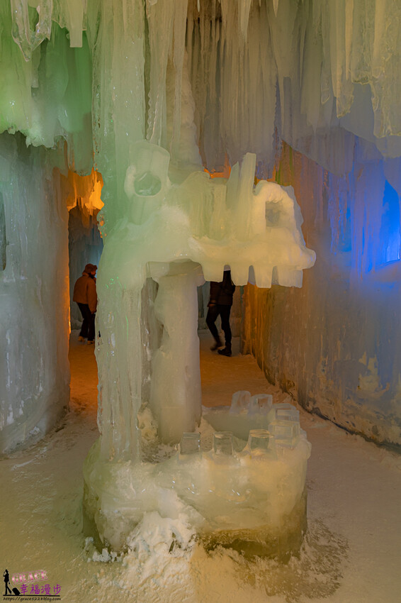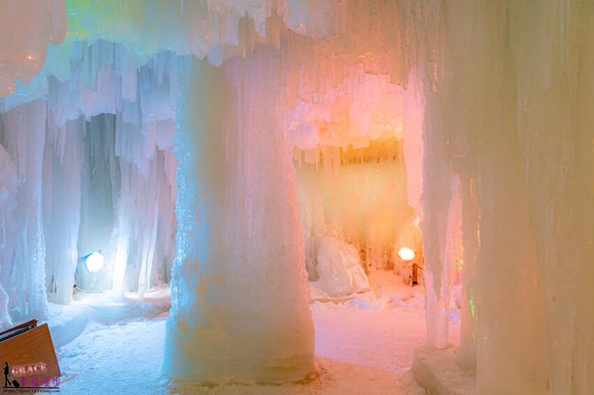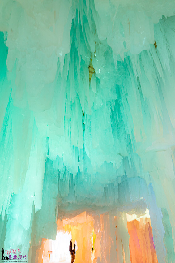 踏進冰洞裡就著奇幻感,冰瀑垂降而下超壯觀,有著如同裙褶形狀很像少女穿的澎裙,柔和的燈光投下更佳漂亮。