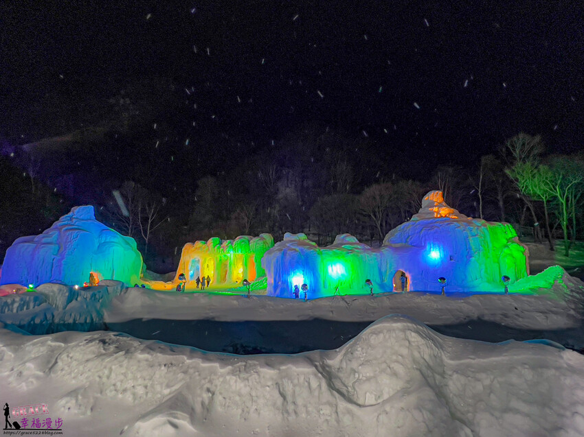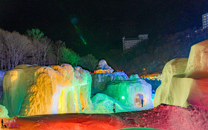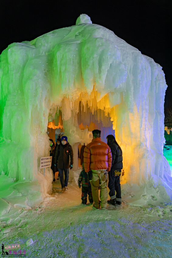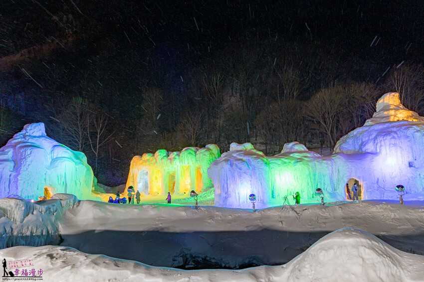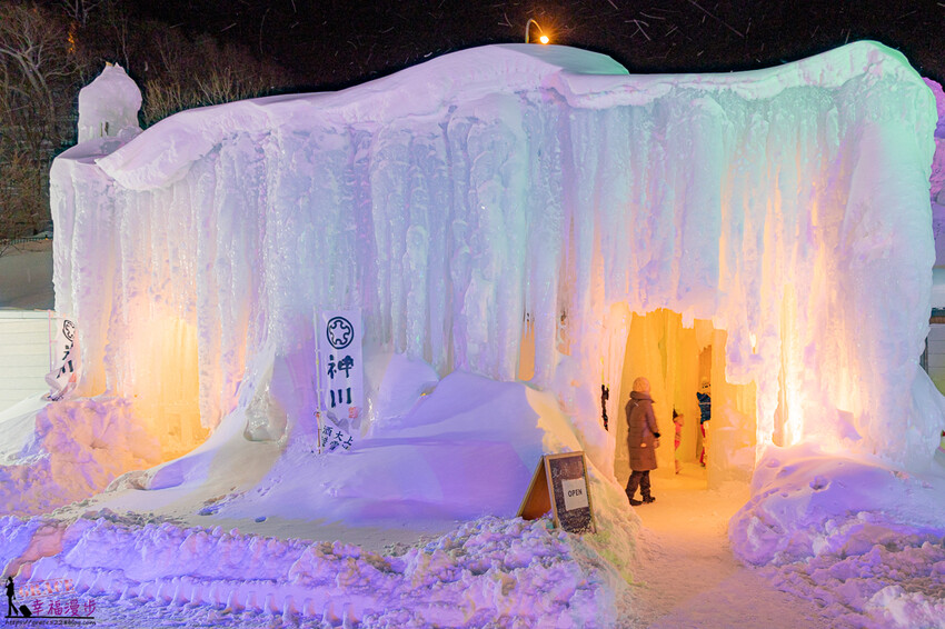 層雲峽冰瀑祭是日本北海道的三大冰祭,應該也是最晚結束的冰瀑祭典,每一年展出時間大約是在1/27~3/17左右,位在石狩川河床、面積約 1 萬平方公尺,大約有著30做的冰雕、滑雪道、冰瀑神社和冰酒吧,晚上還會釋放煙火,冬天如果有來北海道玩很推薦來層雲峽冰瀑祭參觀喔!此次照片是在2023年3月所拍攝的,每一年的冰雕造型會略有不同。