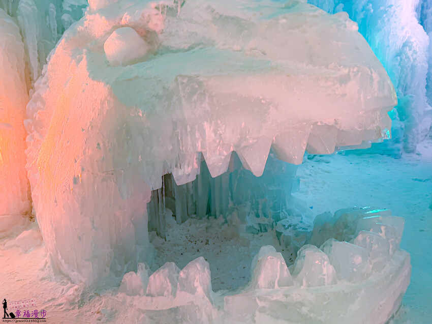 雪屋裡面都有著不同的冰雕展示,這個造型有點像是恐龍造型相當可愛,人還可以走進嘴巴裡面拍照喔!