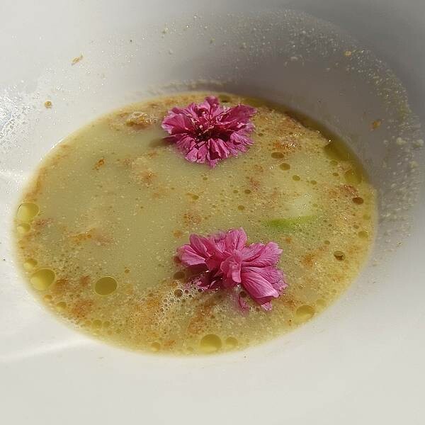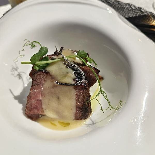 使用生食級干貝炙燒後,伴著主廚的特調醬汁,看那綠色醬泥是青豆泥,乳白色有點像馬鈴薯泥加入黑胡椒,旁邊居然是豬肉干烤過,增添了俏皮感