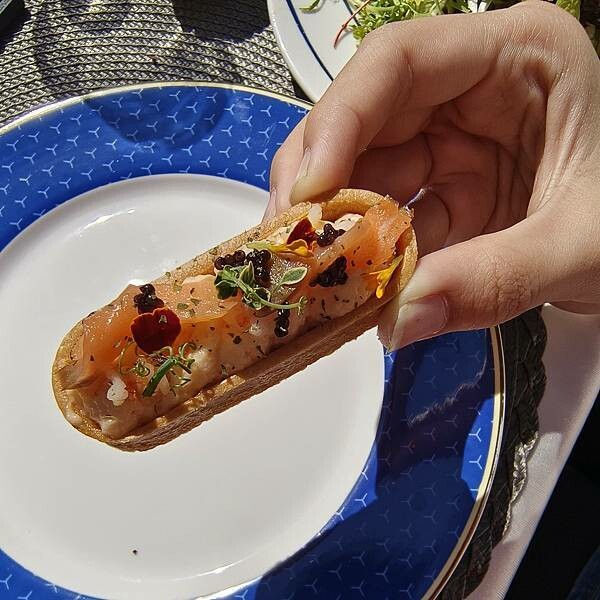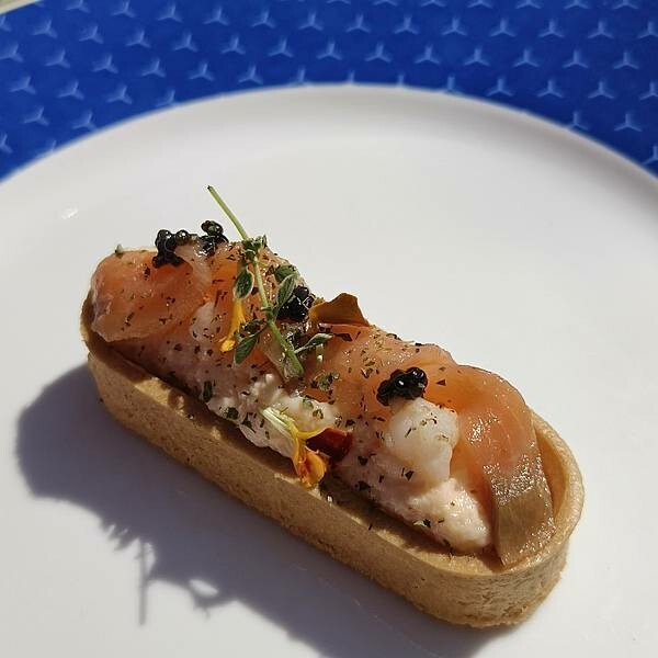 酥脆的塔皮上頭鑲入加有哇沙米的龍蝦沙拉,帶點微嗆的刺激,搭配上頭的煙燻鮭魚超對味