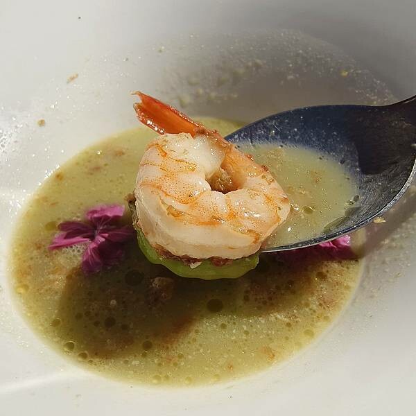 可別小看這道雞湯,這可是事先已先燉煮多天,喝起來味道雖濃郁,但入喉卻非常的清爽,裡頭還有整尾去殼鮮蝦及絲瓜
