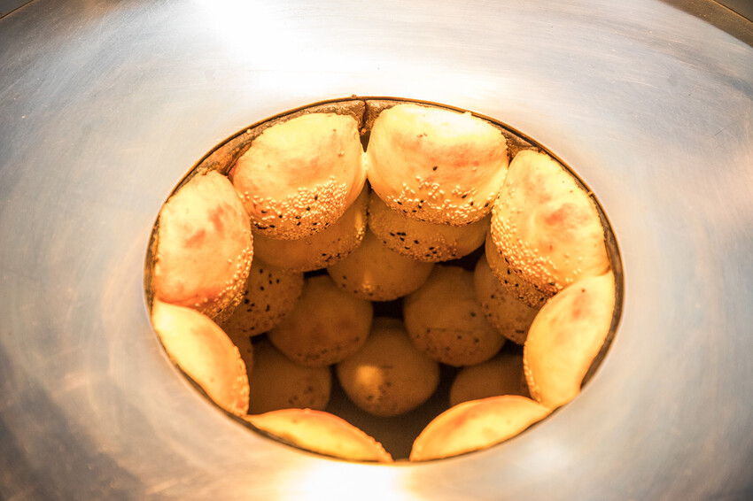做好的胡椒餅就會拿到烤爐旁邊,老闆會把一顆顆胡椒餅貼在炭爐裡,邊烤的同時老闆還會不時打開蓋子觀察胡椒餅烤的狀況來調整火力