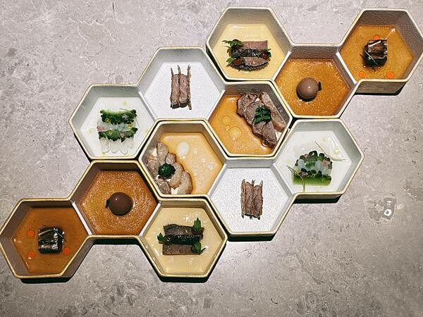 首先上桌的是將江南水上人家拿來迎賓的小遊戲七巧板結合中菜用餐前的桌上小菜,搭配華人常用的六種食物醃漬保存方式: 醋醃、粉醃、醬漬、酒漬、醬滷、油封.小菜各個精巧可口,